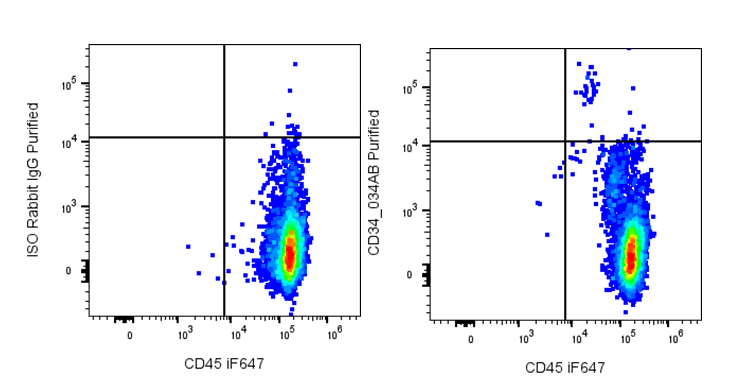 CD34 (gp105–120) is a type I monomeric sialomucin-like glycophosphoprotein with a molecular weight of 105–120 kDa, expressed on hematopoietic stem and progenitor cells, bone marrow stromal cells, capillary endothelial cells, embryonic fibroblasts, and some neural tissues. CD34 serves as a widely used stem cell marker and mediates cell adhesion and lymphocyte homing through interactions with L-selectin and E-selectin ligands. CD34 expression is dynamic and reversible, reflecting specific states of hematopoietic development, including proliferation, differentiation, and altered adhesion properties. Multiple epitopes have been identified based on differential enzymatic sensitivity. Clinically, CD34 is expressed in ~40% of acute myeloid leukemias and 65% of pre-B acute lymphoblastic leukemias, but only 1–5% of acute T-lymphoid leukemias. It is also used to assess stem cell counts for transplantation and can provide prognostic information in certain cancers.